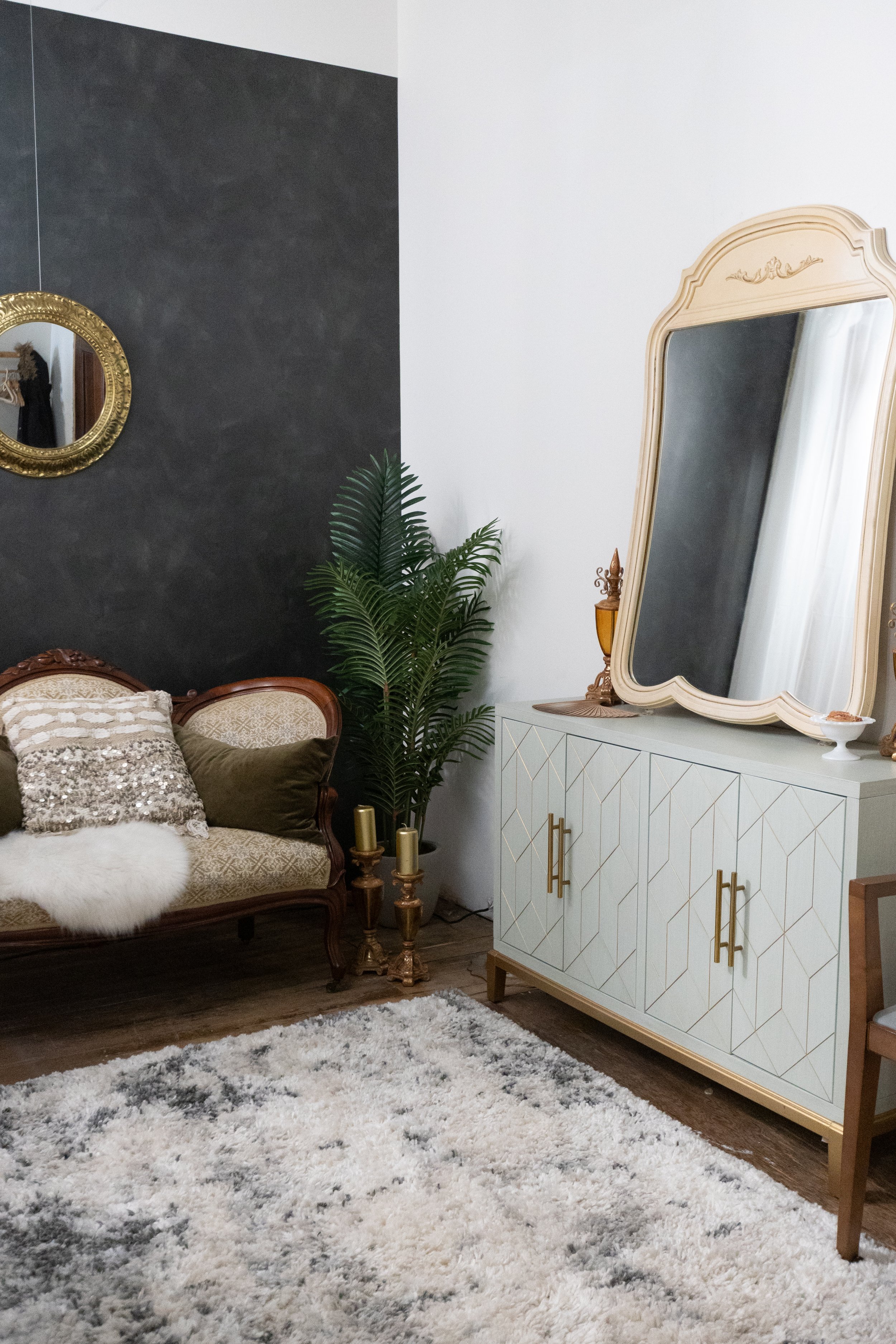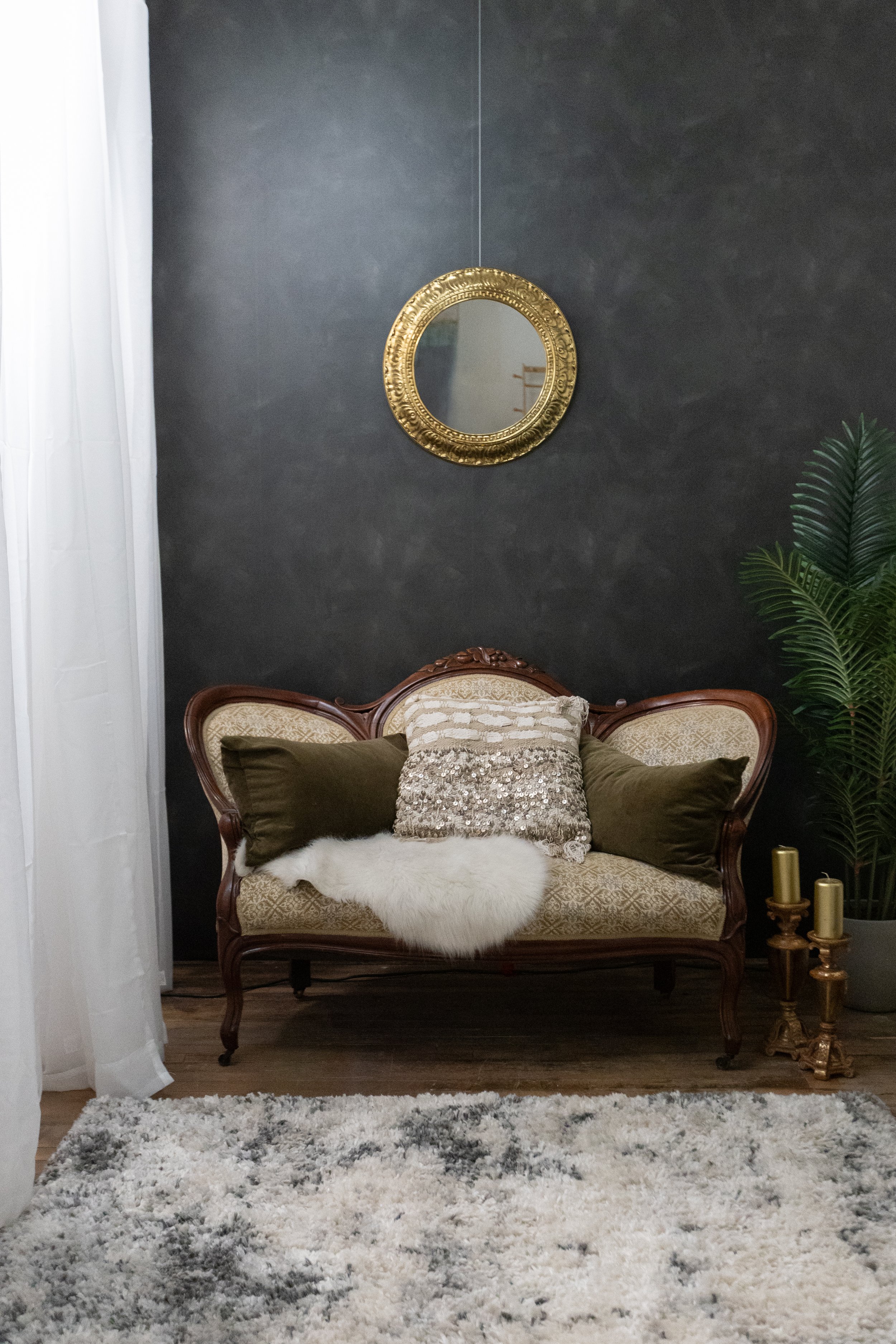 Inside, you'll find a curated collection of furnishings, including an elgagant set featuring a vintage late 1800’s loveseat with gold details, an edgy black and white set, and lots of greenery and sitting spaces.